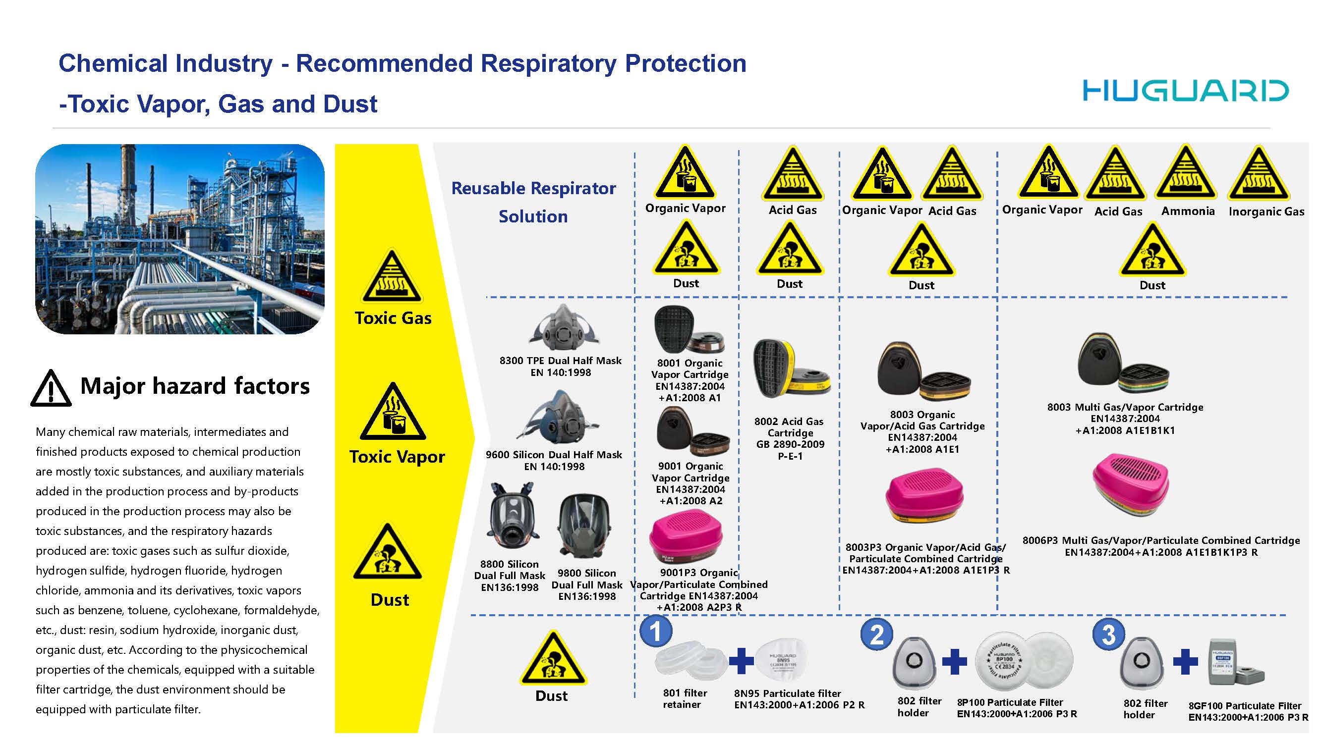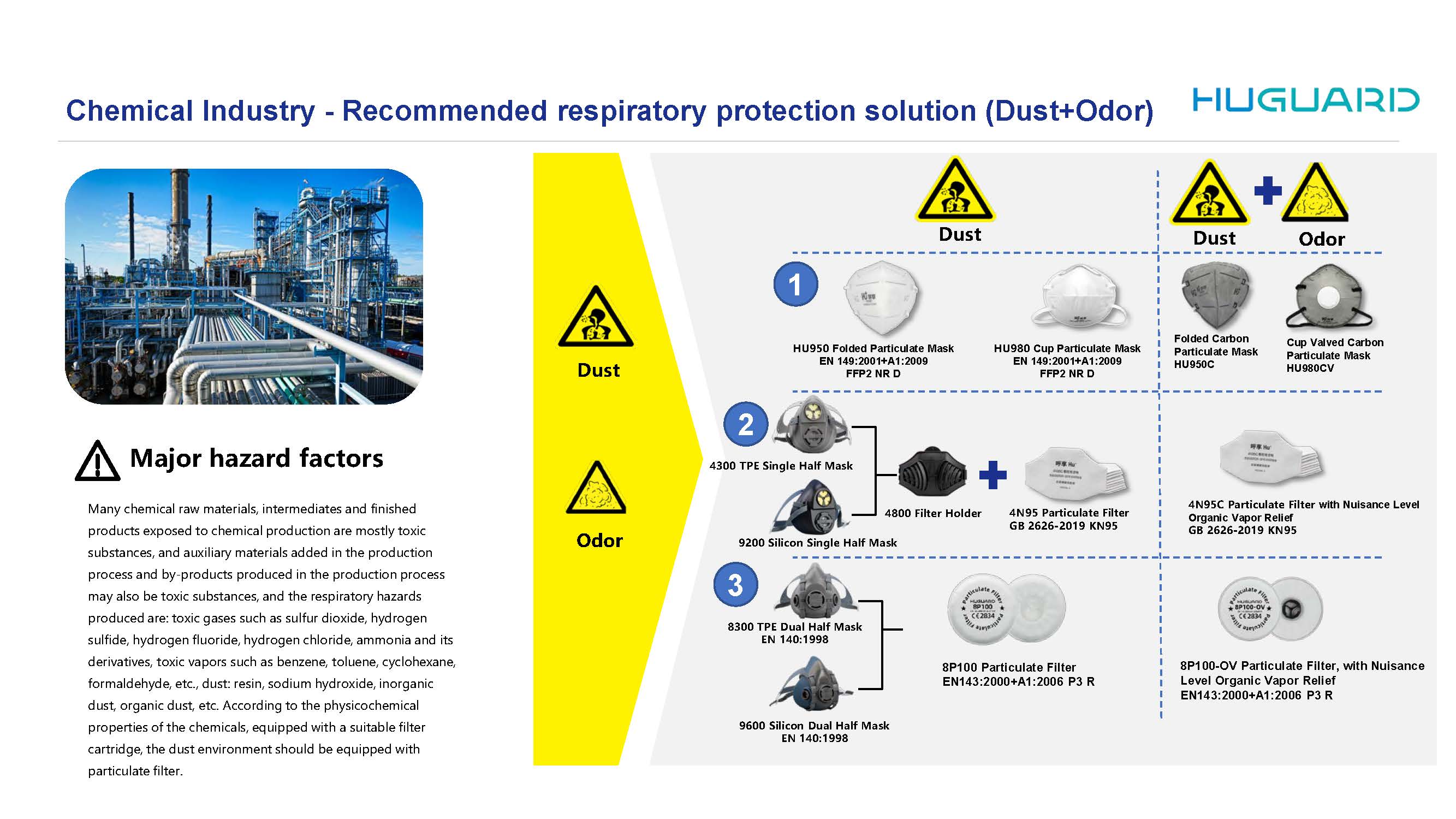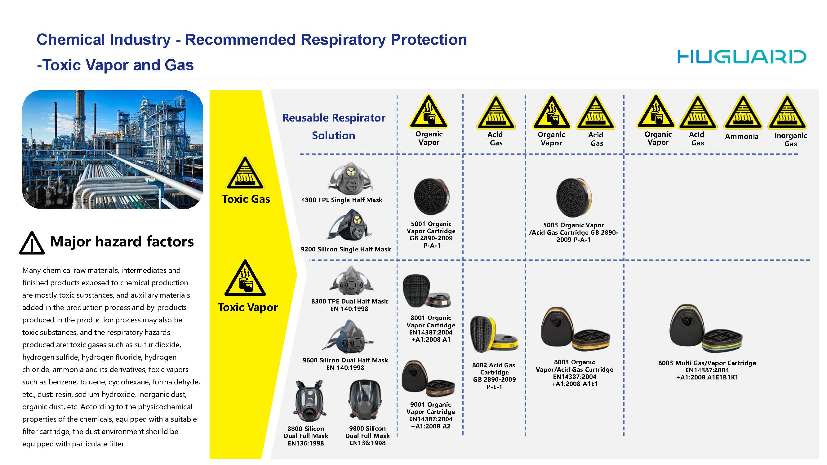 Las plantas químicas pueden producir muchos peligros respiratorios y causar un gran daño al cuerpo humano. Por ejemplo, vapores tóxicos, gases tóxicos. La inhalación puede causar depresión del sistema nervioso central y del sistema respiratorio de la persona. Las principales manifestaciones son debilidad de las extremidades, mareos, náuseas y vómitos, y opresión en el pecho. En casos severos, puede causar confusión, dificultad para caminar, convulsiones o coma.